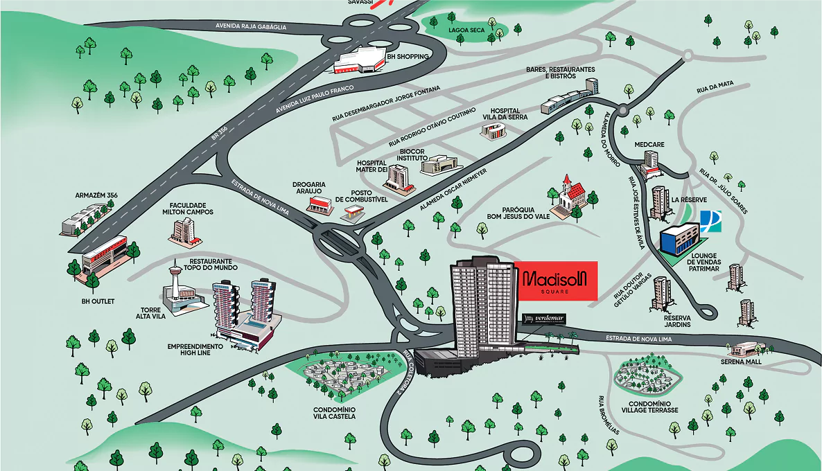 O Madison Square está localizado em uma posição estratégica, rodeado pelas belas montanhas de Nova Lima, mas a poucos minutos de todo o agito e opções de serviços da Av. Oscar Niemeyer e do Belvedere. E o melhor: um verdemar para você*.